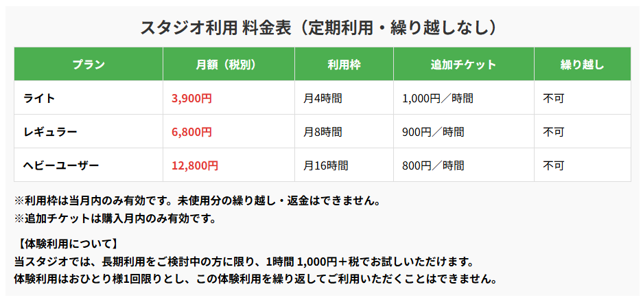 1. ご利用形態 当スタジオは、原則として定期利用(長期契約)のお客様向けの施設です。
