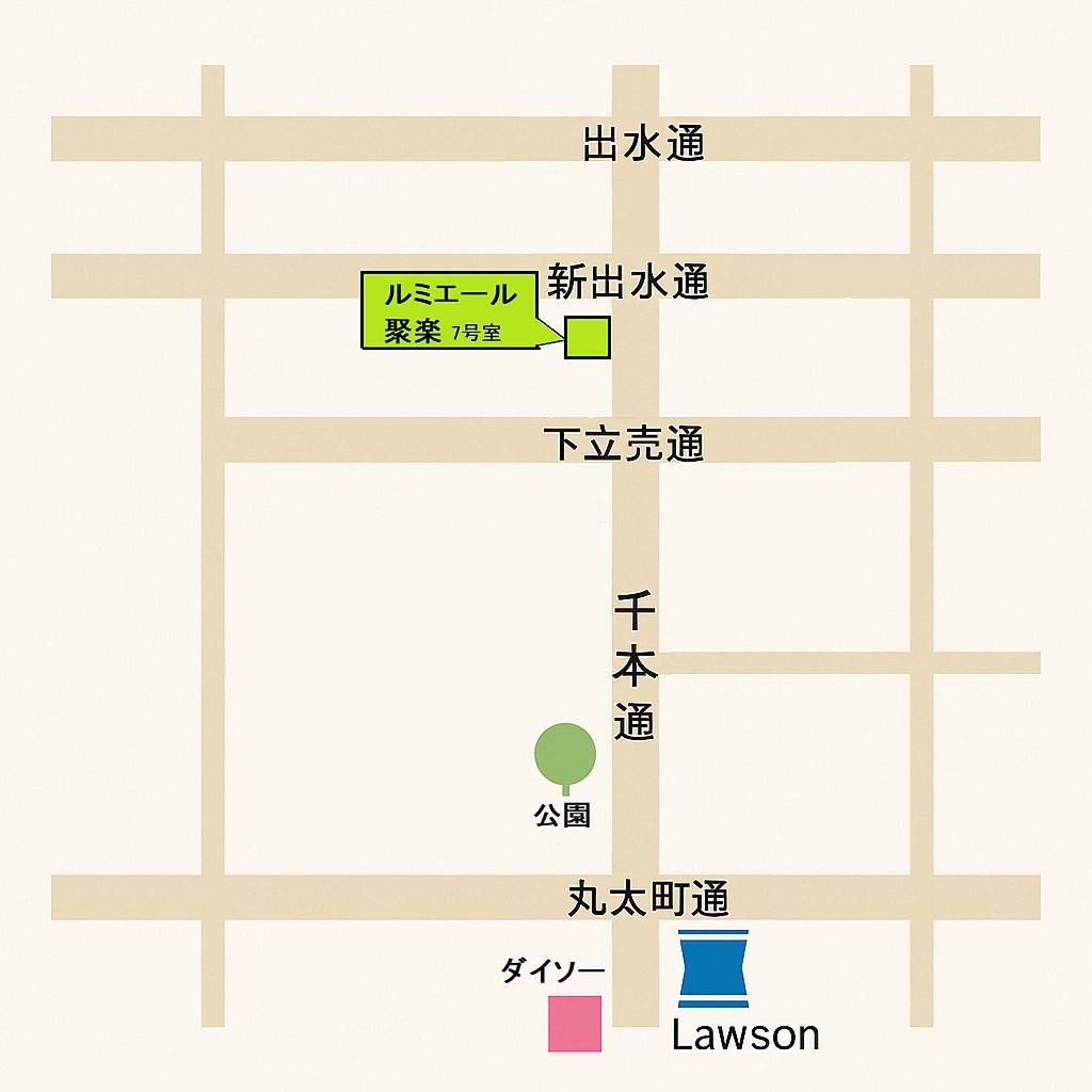 千本丸太町から北に徒歩数分、千本下立売の少し北です。西側にあるマンションで、オートロックを解除してお入りいただく必要があります。